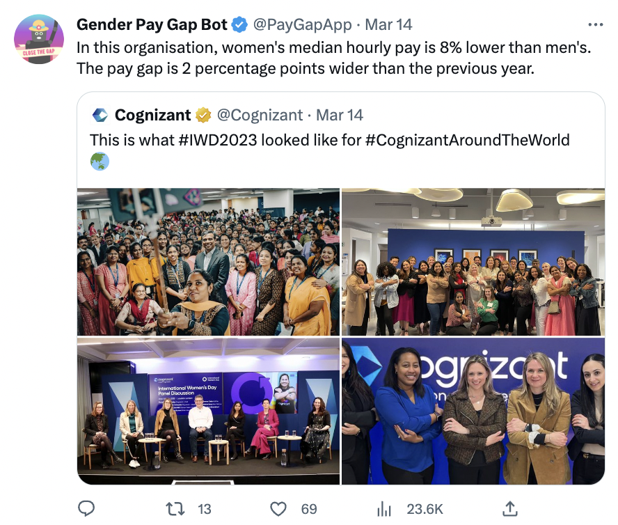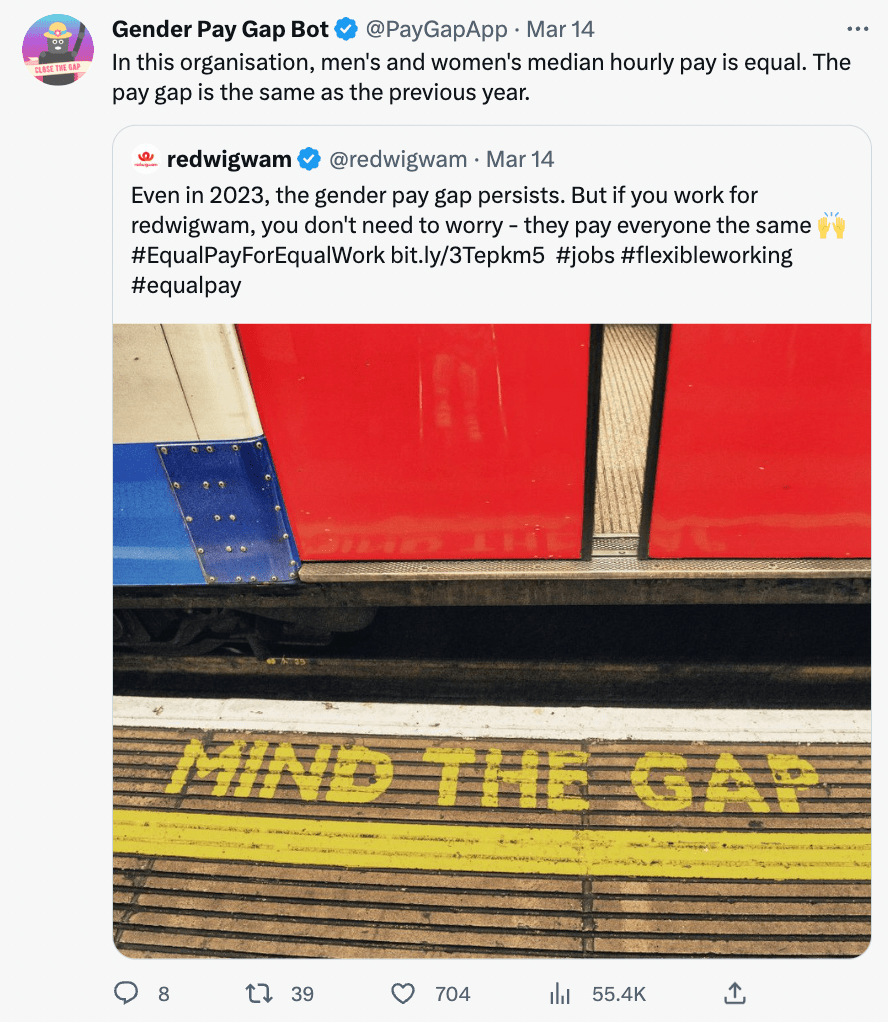 So this year it’s not an IWD campaign that makes this blog, but actually a nifty piece of technology designed to call out the brands who create them. Those that deserve it, that is. The PayGap app is a bot that retweets company’s IWD messages, highlighting disparity (if there is one) in pay between men and women. And, something new for this year, how much this aperture has increased in the 12 months. It’s really important for brands to only promote values they actively support, not just stick to “cut-and-paste platitudes” once a year.